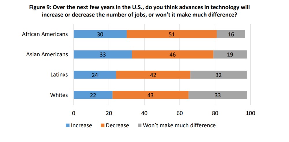 Meanwhile, white millennials are the least worried about technological advances negatively affecting their employment prospects, with just 5 percent of members being “very concerned.”