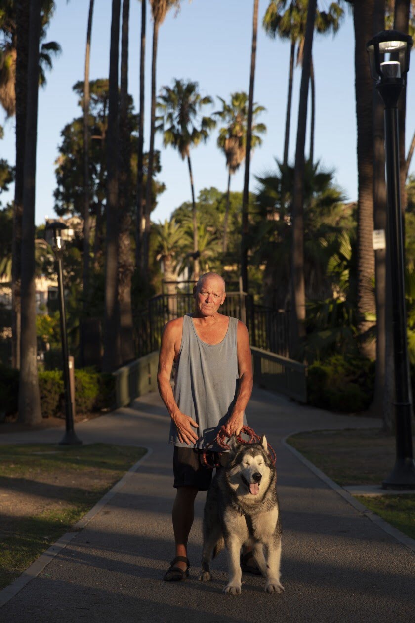 Shane Isaacson, a homeless military veteran, with his service dog, Bear, reads late into the night at Echo Park Lake in Los Angeles.(Liz Moughon / Los Angeles Times)