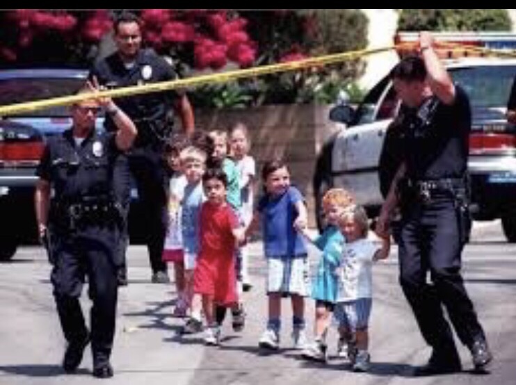 Children from the Jewish Community Center in Granada Hills are escorted to safer ground by LAPD officers after a gunman open fire at the center on Aug. 10, 1999. Three children and two adults were wounded (Myung J. Chun, Los Angeles Times)