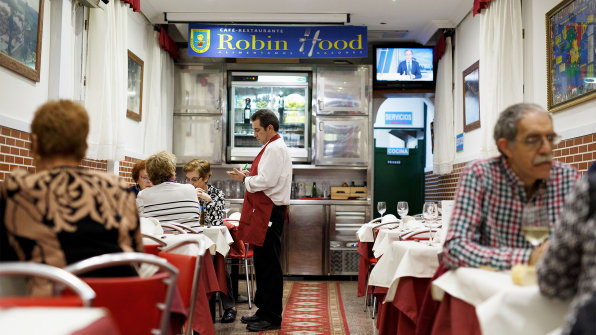 Through the door of a small brick building in Madrid, customers sit down to dinner at tables covered in white cloth. Drinks are poured into crystal glasses, and a three-course meal of mushroom consommé, roast turkey and potatoes, and vanilla pudding fills the plates. The restaurant welcomes around 100 guests a night, but none of them pay. They are homeless, and crowds who dine at the Robin Hood restaurant for breakfast and lunch foot the bill so dinner guests can eat free of charge. For paying customers, shelling out a little extra for basic ham, croquetas, and juice earlier in the day is kind of the point: They’re drawn to the restaurant knowing that their meal will help to feed the hungry.